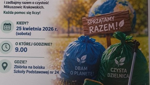 Szanowni Rodzice; Rada Osiedla Mikuszowice Krakowskie zachęca do wzięcia udziału w Akcji Sprzątania Świata. Termin: 25.04.2026r Zbiórka:...