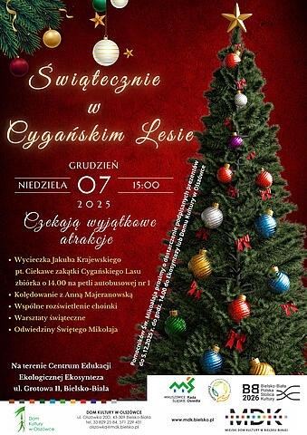 Dom Kultury w Olszówce, Rada Osiedla Mikuszowice Śląskie, Centrum Edukacji Ekologicznej Ekosynteza zapraszają na Świątecznie w Cygańskim Lesie. Spotkanie odbędzie się 7 grudnia 2025 r. o godz. 15.00 w siedzibie Centrum Edukacji Ekologicznej Ekosynteza w Bielsku-Białej przy ul. Grotowej 11. Wcześniej o godz. 14.00 wycieczka Jakuba Krajewskiego pt. Ciekawe zakątki Cygańskiego Lasu.